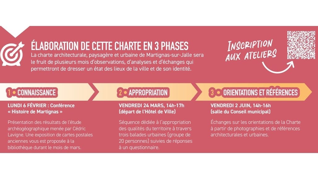 La charte architecturale, paysagère et urbaine de Martignas-sur-Jalle sera le fruit de plusieurs mois d’observations, d’analyses et d’échanges qui permettront de dresser un état des lieux de la ville et de son identité. Plusieurs ateliers à venir (sur inscription) :