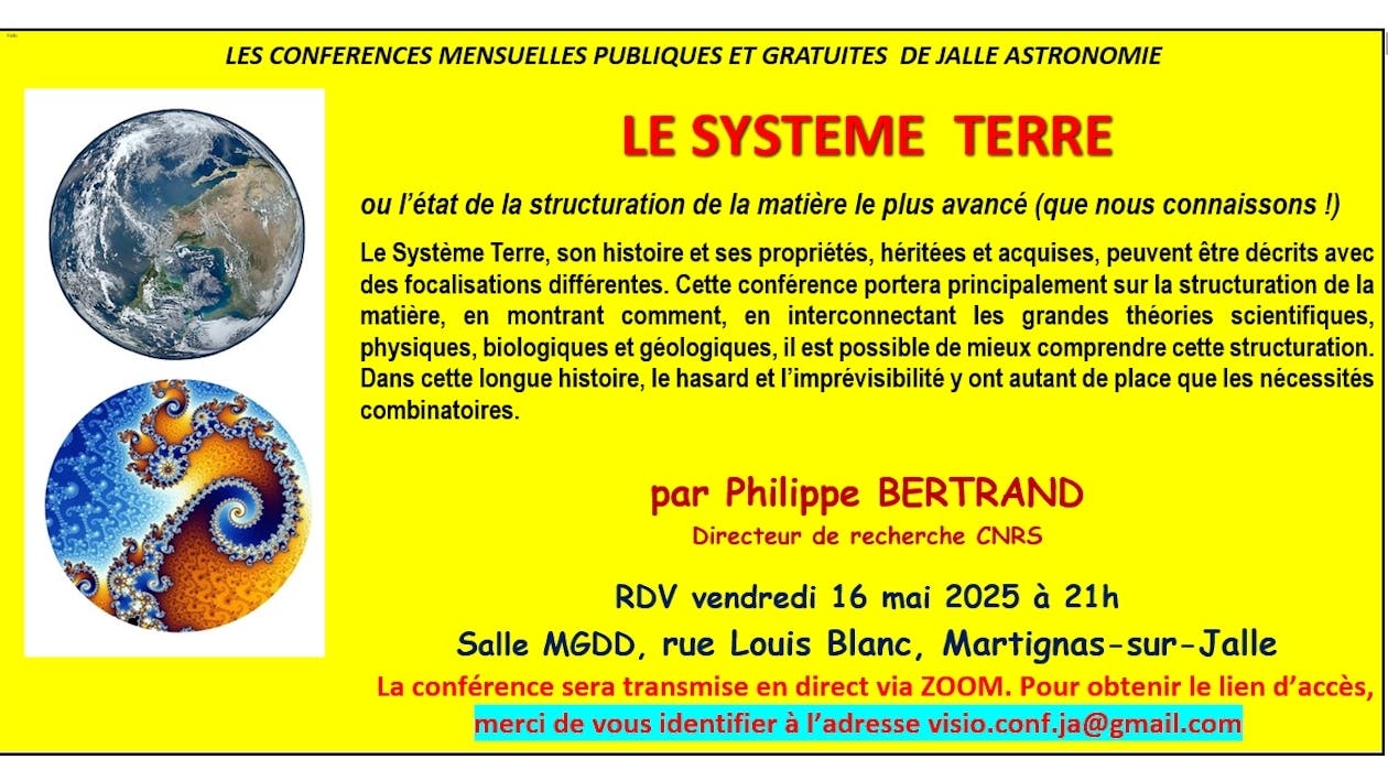 JALLE ASTRONOMIE vous invite à assister à la CONFERENCE "LE SYSTEME TERRE" ou l'état de structuration de la matière le plus avancé (que nous connaissons!) par Philippe BERTRAND, Directeur Recherche CNRS.