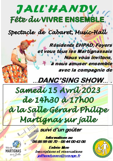 RAPPEL : NE MANQUEZ PAS LA FETE DU VIVRE ENSEMBLE Spectacle offert par JALL'HANDY à la Salle Gérard-Philipe de Martignas sur Jalle le Samedi 15 Avril 2023 à 14h00 Ouvert à tout le monde; L'entrée est gratuite et dans la limite des places disponibles dans la salle G Philipe.